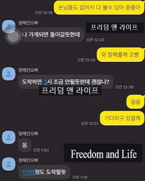 해당 언론사가 입수한 자료에는 정해인과 마담 A 씨가 나눈 메시지도 있습니다. 이에 대해 굿 플레이스 관계자는 "정해인은 사람들의 눈을 피해 9월 1일 새벽 1시가 넘어 굿 플레이스에 왔던 것으로 알고 있다"라며 그 근거로 당시 마담 A 씨와 정해인이 나눈 대화 내용을 해당 언론사에 제공했습니다.